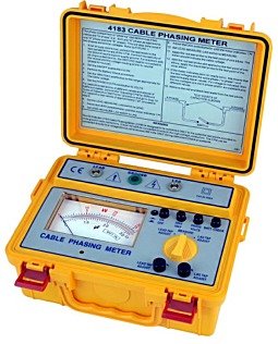 SEW0049-4183 CP CABLE PHASING METER ● Safely operates at low voltage ● Measures system voltage. ● Measures capacitance of test point if system voltage is known. ● Checks phase rotation of cables. ● Phases out cables. ● Rugged - comes with portable case. ● Operates from potential test point of elbow connectors. ● Battery operated. Phase sequence indicators