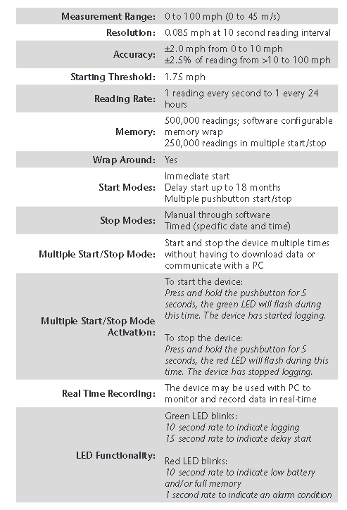 | Maximum Measurable Speed | 100 mph (contact factory about use at higher wind speeds) |