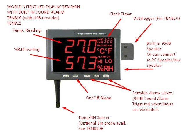 TEN810-Datalogging Large Wall Display Temperature /Humidity Monitor with 95dB Sound Alarm/Controller
